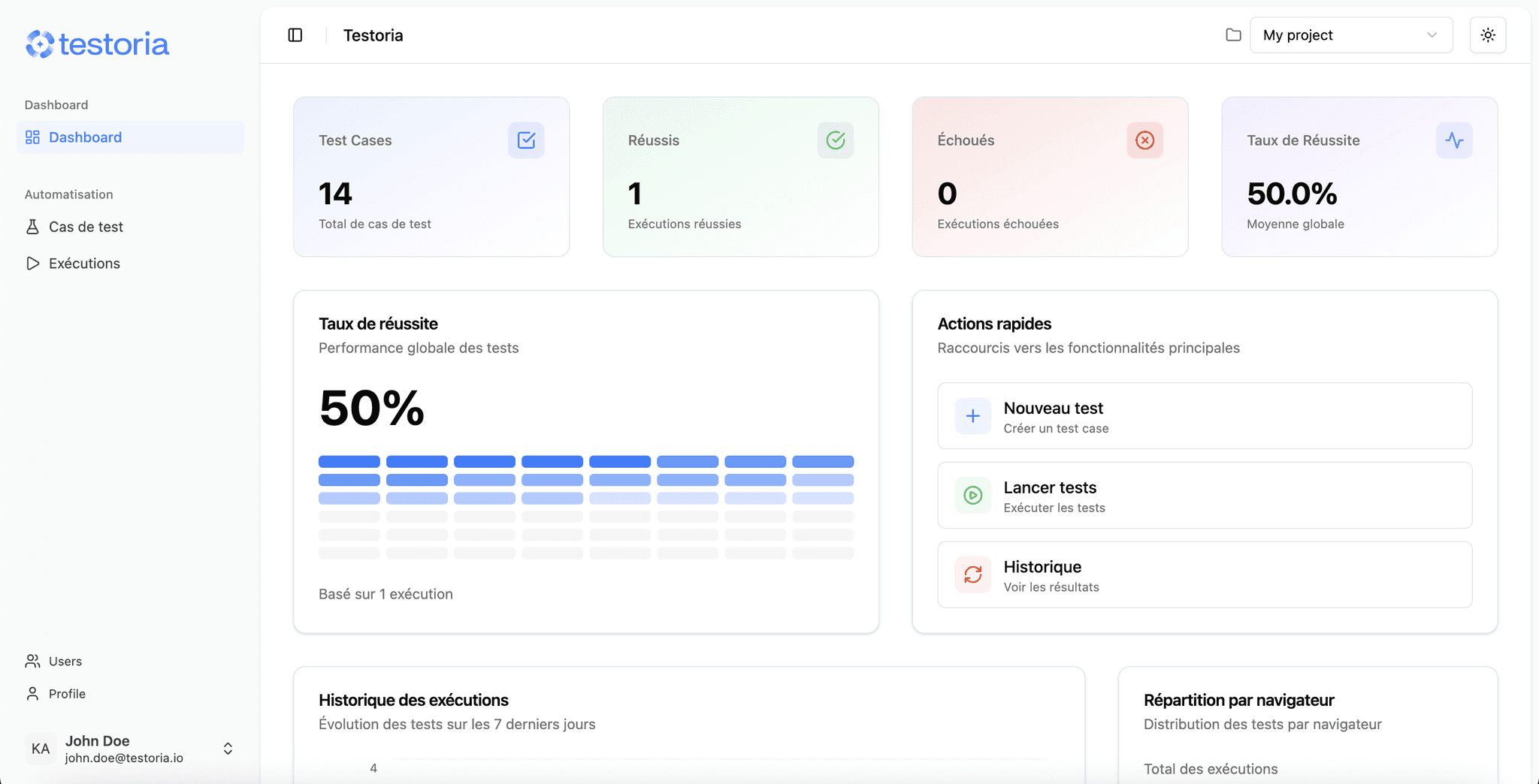 Ajoutez vos scénarios et lancez vos tests immédiatement. Testoria fonctionne avec toutes les applications web, sans configuration complexe.